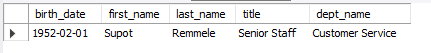 SELECT a.birth_date, a.first_name, a.last_name, b.title, d.dept_name