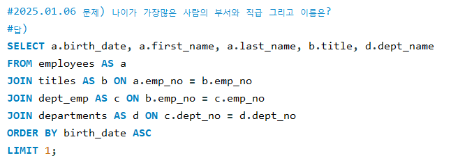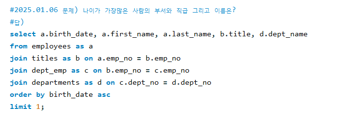 #2025.01.06 문제) 나이가 가장많은 사람의 부서와 직급 그리고 이름은?