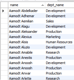 CONCAT(last_name, ' ', first_name) AS name, dept_name